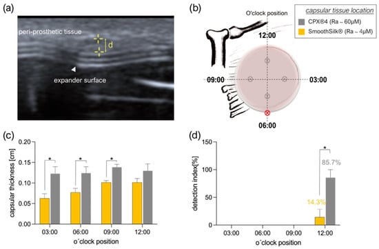 Directly before the expander was exchanged, one single experienced radiologist (expert for breast ultrasound) determined capsular thickness, liquid accumulation, and signs of expander dislocation in a standardized o’clock position measurement (Figure 6a). An illustrative case of measurement position is shown in Figure 6b. Overall, ultrasound examination confirmed that the fibrotic capsule thickness on the rougher CPX®4 tissue expander was significantly thicker than the capsule formed on SmoothSilk® expanders (Figure 6c; **** p < 0.0001) at 3 of the 4 positions assessed; however, this was not found at 12:00 o’clock. Additionally, we detected exclusively in the 12 o’clock position, in the upper central part of the breast, periprosthetic fluid deposits around both expanders next to the port, with a significant increase around the rougher CPX®4 device (Figure 6d). However, expander identification, due to technical reasons (SmoothSilk®; integrated port), was not possible for the radiologist during the ultrasound assessment. Ultrasound assessment documentation for every patient will be provided upon request.