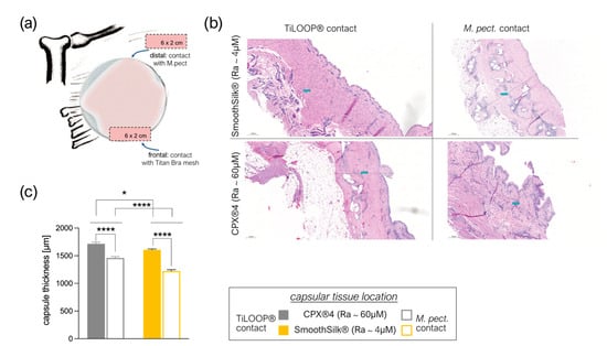 We studied 20 excised capsules in five patients, with samples collected (Figure 7a) anterior at the TiLOOP®/expander covered zone, and posterior at the expander/M. pectoralis contact zone in both breasts, around both tissue expanders. Comparison of fibrotic capsule thickness (Figure 7b) revealed not only a significantly thinner capsule around SmoothSilk® expanders with reduced surface roughness (Ra~4 µM (Figure 7c; frontal contact zone: * p = 0.0361, distal zone *** p < 0.0001)), but also a biologic effect of the Titan containing TiLOOP® pocket Bra, used for expander pocket fixation. The capsule was significantly thicker at the frontal TiLOOP®/expander contact zone around both expanders compared to the titan-free location at the distal M. pectoralis/expander contact zone (Figure 6c, CPX®4: **** p < 0.0001, SmoothSilk®: **** p < 0.0001).