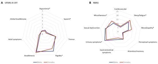 (A) Mean score of sub-scores of the UPDRS-III-OFF at baseline in PD males vs. females; *, p < 0.0001. (B) Mean score on each domain of the NMSS at baseline in PD males vs. females; *, p < 0.05; Sleep/fatigue, p = 0.041; Mood/apathy, p = 0.003; Urinary symptoms, p = 0.047; Miscellaneous, p = 0.010.