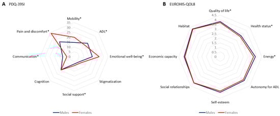 The perception of health-related QoL (PDQ-39SI, 18.88 ± 13.76 vs. 16.05 ± 13.33; p = 0.002) was worse in females. “Emotional well-being” (25.64 ± 20.97 vs. 18.6 ± 18.72; p < 0.0001) and “Pain and discomfort” (33.76 ± 24.31 vs. 21.46 ± 20.2; p < 0.0001) were the domains of the PDQ-39 with the clearest differences with a greater severity in females (Table 3 and Figure 2A), but “Communication” was worse in males (11.99 ± 16.24 vs. 7.74 ± 13.52; p < 0.0001). With regard to the EUROHIS-QOL8, a trend in significance was detected for a worse perception in females in the total score (3.71 ± 0.56 vs. 3.82 ± 0.53; p = 0.009) and in “Quality of life” (3.73 ± 0.72 vs. 3.86 ± 0.7; p = 0.014), “Health status” (3.07 ± 0.87 vs. 3.23 ± 0.87; p = 0.020), and “Energy” (3.65 ± 0.88 vs. 3.84 ± 0.77; p = 0.004) (Table 3 and Figure 2B). No differences were detected between males and females in terms of autonomy for activities of daily living (ADL) (Table 2).