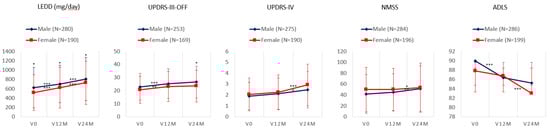 Mean and standard deviation at V0, V12M, and V24M in males vs. females in the LEDD (mg/day) and the score on UPDRS-III-OFF, UPDRS-IV, NMSS, and ADLS; *, p < 0.05; **, p < 0.001; ***, p < 0.0001. The symbol above the line represents the significance of the change between one visit and another (in men and women) while the symbol above the point/diamond represents the difference in that visit between men and women. ADLS, Schwab and England Activities of Daily Living Scale; LEDD, levodopa equivalent daily dose; NMSS, Non-Motor Symptoms Scale; UPDRS, Unified Parkinson’s Disease Rating Scale.