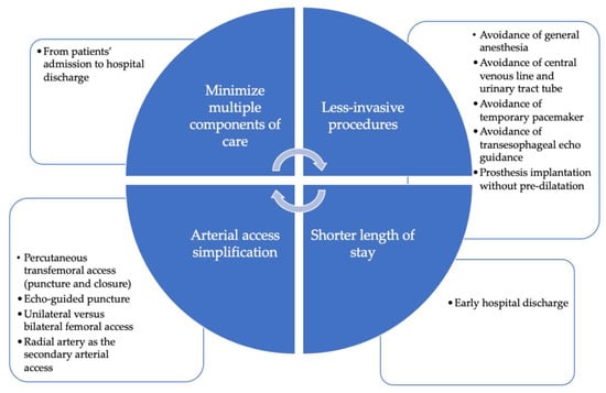 - Sawan, M.A.; Calhoun, A.E.; Grubb, K.J.; Devireddy, C.M. Update on Minimalist TAVR Care Pathways: Approaches to Care in 2022. Curr. Cardiol. Rep. 2022, 24, 1179–1187. [Google Scholar] [CrossRef] [PubMed]