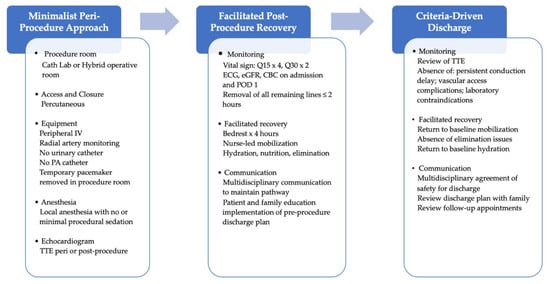 - Sola, M.; Ramm, C.J.; Kolarczyk, L.M.; Teeter, E.G.; Yeung, M.; Caranasos, T.G.; Vavalle, J.P. Application of a Multidisciplinary Enhanced Recovery After Surgery Pathway to Improve Patient Outcomes After Transcatheter Aortic Valve Implantation. Am. J. Cardiol. 2016, 118, 418–423. [Google Scholar] [CrossRef]