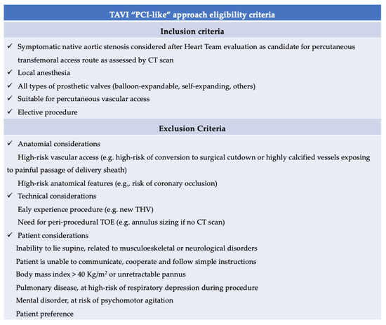 The topic of TAVI with no anesthesiologist in the procedural room is highly debatable. Denimal T et al. compared TAVI under LA, mostly administered and monitored by a dedicated anesthesia team (regular approach; n = 221) versus a new standardized pathway of care, where eligible patients were selected for a minimalist transfemoral TAVI entirely managed by operators, like most interventional coronary procedures (‘‘percutaneous coronary intervention-like’’ approach; n = 137). The results showed no differences in the composite safety endpoint according to the VARC 2 definition (Valve Academic Research Consortium–2) (7.3% vs. 11.3%; OR 0.63, 95% CI 0.37–1.07; p = 0.086) or in the composite efficacy endpoint (4.4% vs. 6.3%; OR 0.78, 95% CI 0.41–1.49; p = 0.45). Patients in the “PCI-like” group experienced a shorter length of stay than those in the regular approach group (5.0 days vs. 6.0 days; p = 0.002). In the standardized approach, all vascular accesses were echo-guided, transoperative echocardiography was not used, and unnecessary catheters were avoided. The operator administered the LA with a subcutaneous injection of lidocaine (20 mg/mL). One scrub nurse was assigned to valve preparation. Fluids and drug administration were under the supervision of the implanting physician; and the monitoring of vital signs, level of consciousness, oxygen saturation, and pain score were carried out by another nurse. The authors observed that 75% of the transfemoral TAVI screened patients were eligible for the “PCI-like” strategy. Notably, the main reasons for ineligibility were related to the early experience of the operator with a new valve or device, and patients’ musculoskeletal disorders causing an impossibility to lie supine. They also pointed out that LA was not considered in the presence of any patient-specific or operator-specific clinical reason to prefer GA (TOE required due to the absence of a CT scan or a high risk of paravalvular regurgitation, patient–prosthesis mismatch, or conversion to surgical vascular access), or because of patients’ preference [16]. The observation that a quarter of patients were ineligible to receive the “PCI-like” approach, even in an experienced, high-volume center, makes it clear that TAVI “simplification” cannot be applied to all patients in all settings. Figure 3 presents the “PCI-like” approach eligibility criteria.