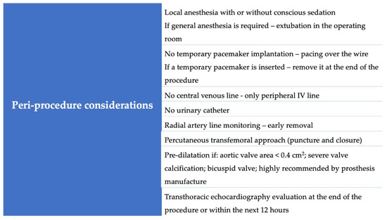 In terms of TAVI indications, we follow the current guidelines that recommend TAVI in elderly patients, in patients at a high surgical risk, or in those with comorbidities who would benefit the most from this procedure [40]. All patients are evaluated by a multidisciplinary, collaborative heart valve team, which evaluates clinical, anatomical, and nonclinical (such as psychosocial) factors that could affect the procedural recovery. A pre-operative CT scan (or 3D echocardiography if a CT scan is not suitable) is assessed to estimate the suitability of femoral access, aortic annulus parameters, and potential procedural risk factors. The procedure is usually conducted in a hybrid room. Standard cases are performed under LA and CS. GA is reserved for complex cases when we anticipate a high risk of complications (e.g., a high risk of coronary obstruction or need for a cutdown femoral access). In these cases, an attempt is made to extubate the patient in the operating room, immediately after the procedure. Regardless of the anesthetic approach taken, an anesthesiologist is present in all procedures. The femoral artery is percutaneously accessed and closed, and US is used to guide the punctures. After the femoral artery puncture, the patient is fully heparinized, while at the end of the procedure, the heparin effect is usually reversed with protamine administration. We have adopted the pacing over the wire technique. However, if we anticipate a high risk of conduction disturbances (e.g., pre-existing right bundle branch block), a temporary pacemaker lead is inserted; if no further disturbances occur, it is removed at the end of the procedure. To safely apply this strategy, we carefully test, before inserting the THV, whether the stimulation obtained by the LV stiff guidewire is adequate, without any pacing capture failure. If, post-operatively, a permanent pacemaker is indicated, we follow the current evidence and implant the device within the first 24 h, avoiding any further delay in hospital discharge [33,41]. We do not routinely insert a central venous line or a urinary catheter, or use TOE. At the end of the procedure or within the next 24 h, a TTE is performed to provide post-TAVI assessment. Pre-dilatation is performed only if highly recommended by the bioprosthesis manufacturer; or in the presence of a severe valve calcification, a bicuspid aortic valve, or an aortic valve area < 0.4 cm2. Following a standard procedure, active mobilization after 4 h is prioritized, and patients are discharged home in the next 24–48 h. In our experience, early mobilization contributes to promoting a rapid return to baseline status, minimizing nosocomial complications, and decreasing length of stay.