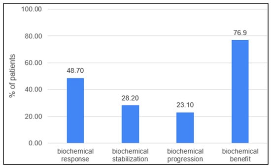 Since the metronomic chemo-endocrine treatment was initially used as a last-resort therapy for heavily pretreated ER+ BC patients, an objective evaluation of tumor response by imaging modalities was not considered a critical aspect and a justified option in most treated individuals. Clinical decisions were based on the patient’s performance status, disease-related symptoms intensity, and lab results involving blood morphology and the biochemical evaluation of organ functions. Treatment efficacy was analyzed retrospectively by the evaluation of overall survival (OS), progression-free survival (PFS), and treatment-induced changes in the CA-15.3 level. Biochemical response (bRR) was defined as ≥50% serum marker reduction, biochemical stabilization (bSD) was defined as a ≤50% reduction, and biochemical progression (bPD) was defined as any increase in CA-15.3 levels. The biochemical benefit (bBR) was defined as any decline in CA-15.3 concentrations.