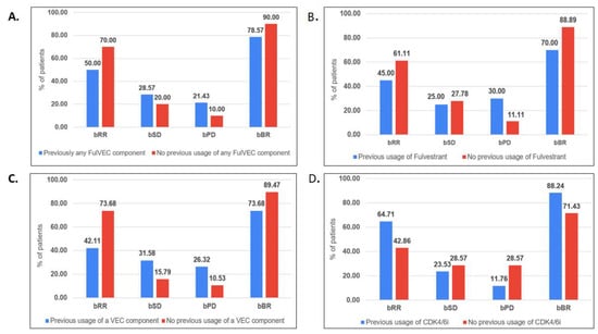 Biochemical efficacy of FulVEC according to previous therapy. (A). Previous use of any FulVEC component, (B). Previous use of fulvestrant, (C). Previous use of any VEC component, (D). Previous use of CDK4/6i. (bRR—≥50% decline in CA-15.3; bSD—1–49% decline in CA-15.3; bPD—any increase in CA-15.3; bBR—any decline inCA-15.3). No significant differences (chi-square test) in biochemical response rates in relationships relative to previous treatments were observed in (A–D).