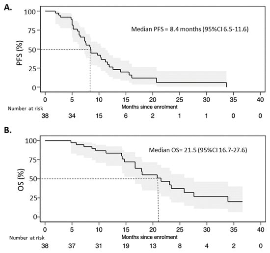 The median progression-free survival in the entire population was 8.4 months (95%CI 6.5–11.6) with 12- and 24-month PFS rates of 21% and 3%, respectively (Figure 3A). The median overall survival of FulVEC-treated patients was 21.5 (95%CI 16.7–27.6) with 12- and 24-month OS rates of 63% and 21%, respectively (Figure 3B).