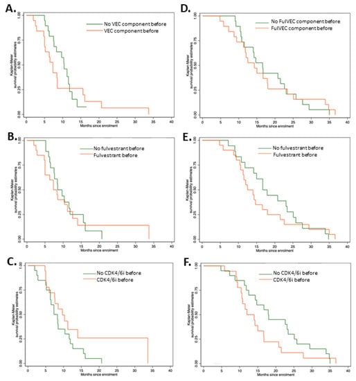 There were no significant differences in PFS irrepective of previous exposure to CDK4/6i, fulvestrant, or FulVEC cytotoxic components (Figure 4A–C). However, patients pretreated with CDK4/6i had a higher median PFS of 9.7 months (95% CI, 5.2–11.6) compared to non-pretreated patients (7.3 months—95% CI, 6.0–14.0). Similarly to PFS, previous exposure to CDK4/6i, fulvestrant or FulVEC cytotoxic components had no impact on OS (Figure 4D–F).