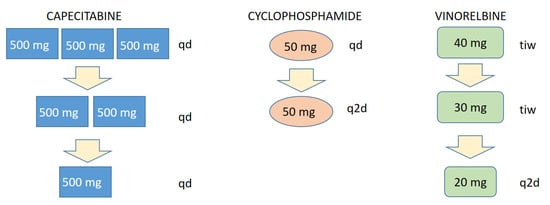- Munzone, E.; Regan, M.M.; Cinieri, S.; Montagna, E.; Orlando, L.; Shi, R.; Campadelli, E.; Gianni, L.; De Giorgi, U.F.F.; Bengala, C.; et al. A Randomized Phase II Trial of Metronomic Oral Vinorelbine plus Cyclophosphamide and Capecitabine (VEX) vs Weekly Paclitaxel (P) as First- or Secon... | OncologyPRO. In Proceedings of the ESMO Annual Meeting; Elsevier: Amsterdam, The Netherlands, 2022. [Google Scholar]