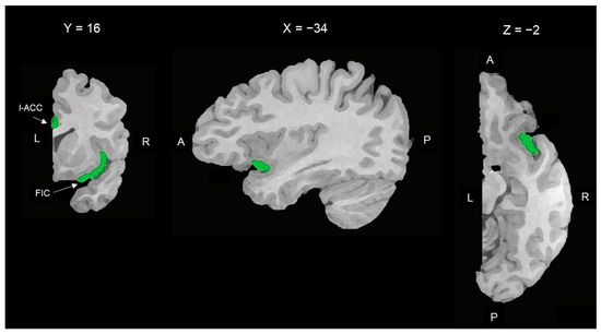 Spatial location of the right ROIs used as the seed region for rsFC analysis. From left to right: coronal, parasagittal, and transversal slices of the right hemisphere. ROIs are indicated in green. l-ACC: limbic anterior cortical cortex (Brodmann area 24b); FIC: fronto-insular cortex (anterior short and accessory gyri of the anterior insula). L = left; R = right; A = anterior; P = posterior.