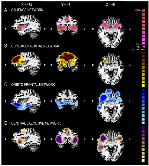 Voxel-wise parceling (fuzzy clustering) decomposed the functional network into four clusters. These clusters were associated with four well-known functional networks, namely the salience network (ACC and insula), the superior frontal network (dorsomedial frontal cortex), the orbitofrontal network (ventromedial prefrontal cortex), and the central executive network (ACC, insula, dorsolateral prefrontal cortex, and supplementary motor area) (Figure 2 and Figure 3) [56].