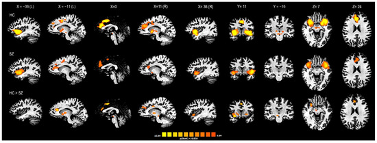 None of the subjects were excluded from falling asleep during the scan. The results of the rsFC of the bilateral FIC and bilateral l-ACC in the whole sample (HCs and SZ) showed that they were part of a frontotemporal network mainly involving the bilateral ACC, insulae, and prefrontal and supplementary motor cortices (Figure 2).