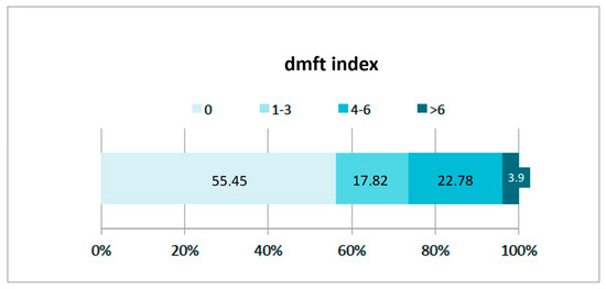 When this index was investigated further, 55.4% had a zero dmft, 17.82% had between 1 and 3, 22.78% between 4 and 6, and only 3.95% had an index over 6 (Table 3) (Figure 1).