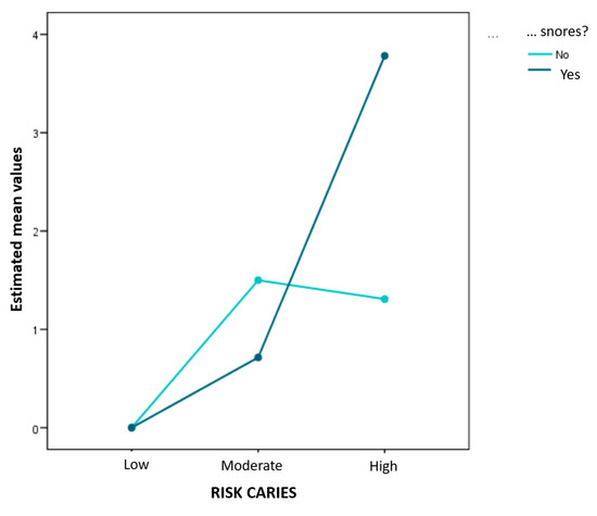 Finally, the ANOVA model was applied to clarify the extent to which sleep disorders affect ECC or whether or not it is simply that those common risk factors are confounding. The results showed that the dmft index remains significantly linked to occasional snoring, but the association depends on the patient’s level of risk (p = 0.008), increasing with an increasing risk of caries (Table 7) (Figure 2).