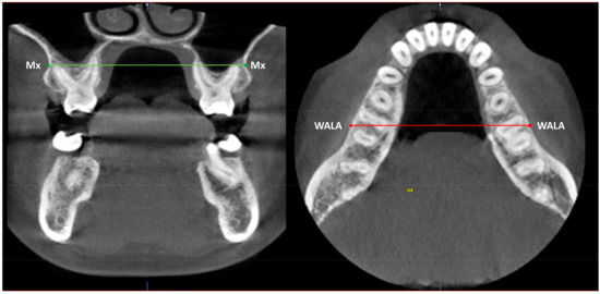 Records taken included CBCT, lateral cephalometry and a digital model (STL file) of the patient dentition. The facial pattern was determined using the VERT index of Ricketts’ cephalometry [18]. A VERT index of −0.5 to +0.5 was interpreted as indicating a mesofacial pattern, > +0.5 as indicating a brachyfacial pattern, and < −0.5 as indicating a dolichofacial pattern. For the analysis of transverse bone discrepancy, a CBCT-based analysis was performed following the method of the University of Pennsylvania [12] (Figure 1). Discrepancy was classified as “with transverse discrepancy” when the maxillary-mandibular difference (Mx-Md) was <5 mm, and as “without transverse discrepancy” in the case of discrepancy ≥ 5 mm.