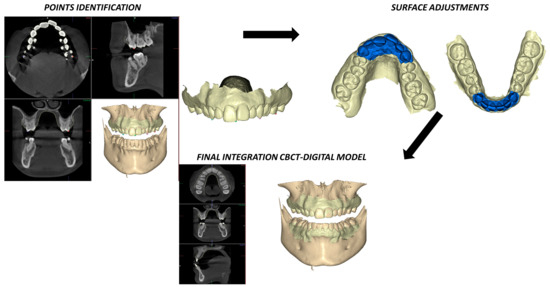 The integration of the digital model (STL file) and the CBCT scan (DICOM files) was carried out with NemoStudio 2018 (Nemotec®, Madrid, Spain) using a dot plotting process. The different CBCT views (axial, coronal and sagittal), together with the three-dimensional (3D) volumetric reconstruction, were used for dot plotting, seeking the most reproducible anatomical areas in both files (CBCT and digital model). The plots were mainly located at the incisal edges, cuspids and bottoms of the main sulci, as the areas of best reproduction between the two. Subsequently, a second surface adjustment was made in order to reduce the margin of error. For this second adjustment, the anterior region of the maxilla and mandible was marked as a reference on the digital model (Figure 3).