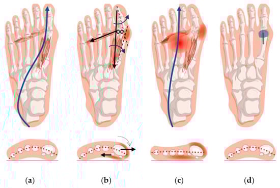 - Hofmann, U.K.; Götze, M.; Wiesenreiter, K.; Müller, O.; Wünschel, M.; Mittag, F. Transfer of plantar pressure from the medial to the central forefoot in patients with hallux valgus. BMC Musculoskelet. Disord. 2019, 20, 149. [Google Scholar]