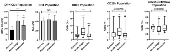 The examined populations of CD4 T lymphocytes in the patients with ACD and healthy controls. iOPN CD4, CD4 T lymphocytes with expression of intracellular osteopontin; CD4, CD4 positive T lymphocytes; CD25, subset of CD4 positive T lymphocytes; CD25h, T lymphocytes with high CD25 expression; CD25hCD127low, T lymphocytes with high CD25 expression and CD127 low expression—regulatory T cells; NS, non-significant; * means statistical significance with p values < 0.05 between patients with acute stage of ACD and controls; *** means statistical significance with p < 0.0001 between patients with acute stage of ACD and controls; ^—statistical significance with p values < 0.05 between patients with acute stage of ACD and remission; ^^/^^^—statistical significance with p values < 0.01 and 0.0001, respectively, between patients with acute stage of ACD and remission.