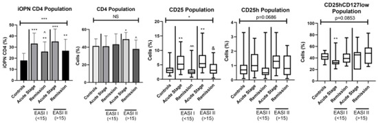 The percentage of selected T lymphocytes according to severity of ACD. iOPN CD4, CD4 T lymphocytes with expression of intracellular osteopontin; CD4, CD4 positive T lymphocytes; CD25, subset of CD4 positive T lymphocytes; CD25h, CD25 high T lymphocytes; CD25hCD127low, CD25highCD127low T cells—regulatory T cells; NS, non-significant; EASI I (<15), Eczema Area and Severity Index in patients with mild to moderate course of the disease; EASI II (> 15), Eczema Area and Severity Index in patients with severe course of the disease; * means statistical significance with p values < 0.05 between patients with acute stage of ACD and controls; **/*** means statistical significance with p < 0.01 and 0.0001, respectively, between patients with acute stage of ACD and controls; ^/^^ means statistical significance with p values < 0.05 and < 0.01, respectively, between patients with acute stage of ACD and remission; & means statistical significance with p values < 0.05 between patients with remission and controls.