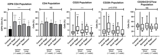 The examinated subpopulations of T lymphocytes in the ACD patients according to duration of skin lesions. iOPN CD4, CD4 T lymphocytes with expression of intracellular osteopontin; CD4, CD4 positive T lymphocytes; CD25, subset of CD4 positive T lymphocytes; CD25h, CD25 high T lymphocytes; CD25hCD127low, CD25highCD127low T cells—regulatory T cells; NS, non-significant; short, the duration of skin lesions <1 week; long, the duration of skin lesions >1 week; * means statistical significance with p values < 0.05 between patients with acute stage of ACD and controls; **/*** means statistical significance with p < 0.01 and 0.0001, respectively, between patients with acute stage of ACD and controls; ^—statistical significance with p values < 0.05 between patients with acute stage of ACD and remission.