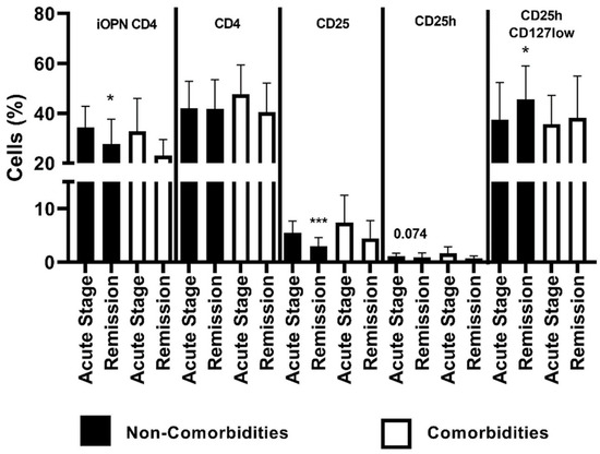 In patients lacking comorbidities, the percentage of iOPN CD4 cells was significantly higher in the acute ACD stage than in remission (p < 0.05). The proportion of CD4 population did not differ between patients lacking comorbidities and with comorbidities. In patients without comorbidities, the percentage of CD25 T cells was statistically higher in acute stage than in remission (p < 0.0001). A higher proportion of CD25h T cells was also observed in patients lacking comorbidities in the acute stage of ACD, but the difference was not statistically significant (p = 0.074). In patients without comorbidities, the CD25hCD127low population was statistically higher in remission than in the acute stage of ACD (p < 0.05) (Figure 4).