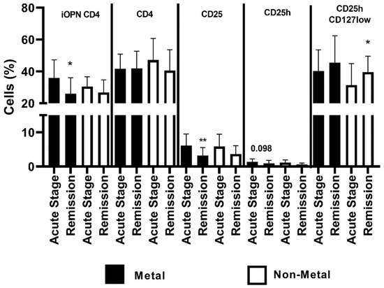 In patients with allergy to metals, the level of iOPN CD4 T cells was statistically higher in the acute stage than in remission (p < 0.05). The proportion of the CD4 population did not differ in patients with allergies to metals and other allergens. In patients with allergy to metals, the CD25 T cells were statistically higher in the acute stage of ACD than in remission. In patients without allergy to metals, the percentage of CD25hCD127low was statistically higher in remission of ACD than in the acute stage of the disease (Figure 5).