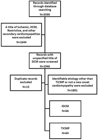 Flow chart of study population. DCM—dilated cardiomyopathy; HCM—hypertrophic cardiomyopathy; IDCM—idiopathic dilated cardiomyopathy; TICMP—tachycardia-induced cardiomyopathy.