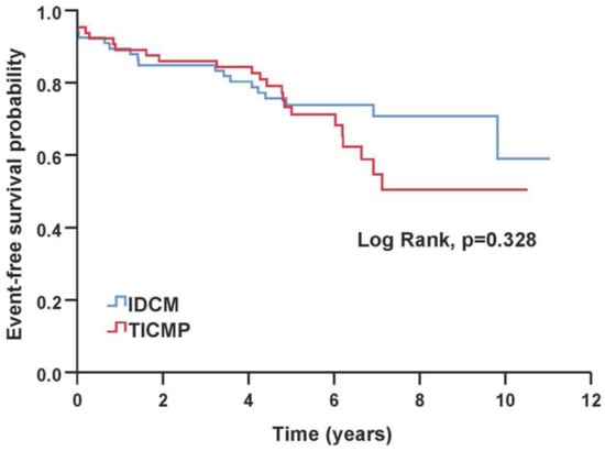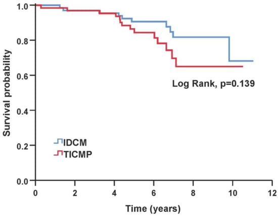 Kaplan–Meier estimates of overall survival based on the type of cardiomyopathy. IDCM—idiopathic dilated cardiomyopathy; TICMP—tachycardia-induced cardiomyopathy.