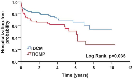 Kaplan–Meier survival probabilities for patients admitted for a first heart failure hospitalization. IDCM—idiopathic dilated cardiomyopathy; TICMP—tachycardia-induced cardiomyopathy.