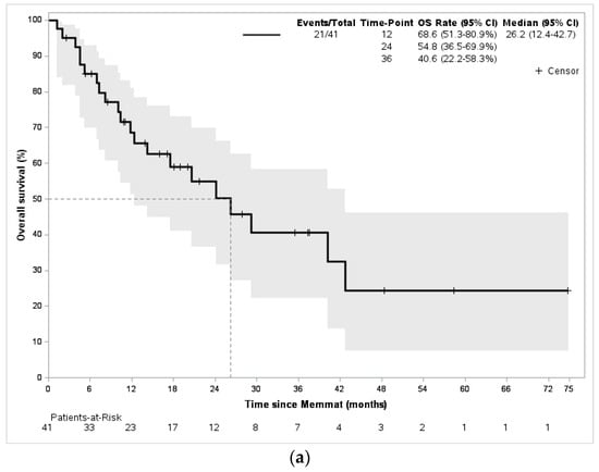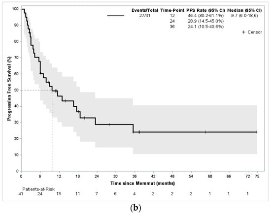 Progression-free survival (PFS) was defined as time elapsed from recurrence that triggered the initiation of the “MEMMAT” regimen to the date of relapse, progression, or death from any cause or, for patients without any events, to the date of last follow-up. Overall survival (OS) was defined as the time elapsed from the date of relapse that triggered the initiation of the “MEMMAT” regimen to the date of death from any cause or, for survivors, to the date of last follow-up.