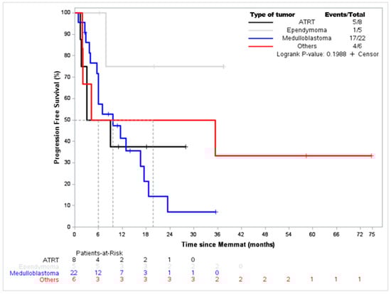 When considering the underlying malignancy, EFS for ATRT and medulloblastoma were, respectively, 6 months and 9.7 months. Interestingly, for the five ependymoma patients, the median EFS was not reached and only one event was reported (Figure 2). Among the seven patients who received radiotherapy during or at the end of the MEMMAT regimen, we observed two complete remissions, one partial remission, one stable disease, and three progressive diseases.