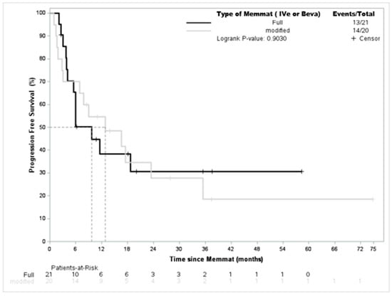 Since a significant proportion of the patients did not receive the full MEMMAT regimen, we investigated whether this had a significant impact on survival. As shown in Figure 3, there was no impact on event-free survival when comparing full versus adapted MEMMAT (7 months (4.1-NE)) vs. 13 months ((3.0–35) p = 0.9)). Interestingly, when looking at further details of the impact of IVe therapy or bevacuzimab on EFS, we did not find any difference either (bevacizumab (7.4 months (1.4-NE) vs. 11.5 months (6.0–18.6) p = 0.68) or IVe therapy (16.6 (3–35) vs. 8 months (3.9-NE) p = 0.73)). Lastly, a similar specific analysis run on the medulloblastoma population did not show any difference for PFS either (17 months (1–26) vs. 20 (4.5—not reached) p = 0.44)).
