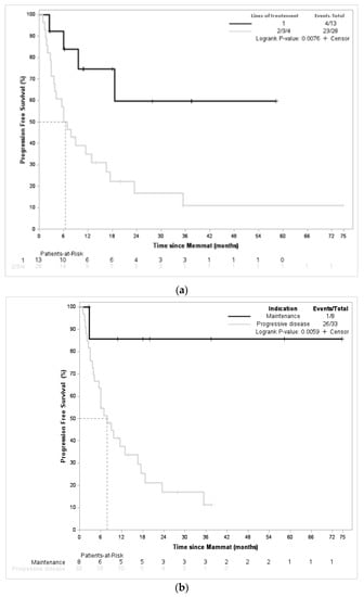 Event-free survival according to the number of previous lines of treatment and setting (progressive disease vs. maintenance). (a) EFS according to number of previous lines of treatment (1 vs. >1). (b) EFS according to the setting at the initiation of MEMMAT (maintenance vs. relapse).