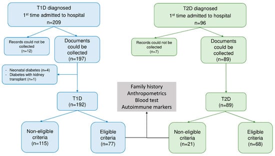 All recruited patients were measured for pancreatic islet autoantibodies, such as ICA and GADA and thyroid autoantibodies. The study excluded any participants meeting any of the following criteria: (c) Medical records could not be collected; (d) Neonatal diabetes or monogenic diabetes; (e) Post-transplant diabetes mellitus; (f) Non-T1D and non-T2D. Figure 1 illustrates the flowchart for the study recruitment (Figure 1).