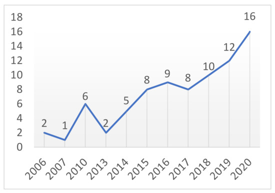 The cohort included 61 women and 18 men. The mean age was 45 years (standard deviation (SD) 15), mean weight was 64.7 kg (SD 12.8), mean height was 167.9 cm (SD 9.1), and BMI was 22.8 kg/m2 (SD 3.4). Three patients had confirmed osteoporosis, and one had hypothyroidism. Two patients presented with associated upper-limb fracture. The incidence tended to increase over the years (Figure 1). Using the AOSpine classification, neurologic impairment was seen in 6 cases: 1 bladder incontinence (N3), 3 radiculopathy (N2), and 2 spinal cord compression (N3) [19]. Five neurological deficits were only temporary deficits, and one patient had long-term sequelae.