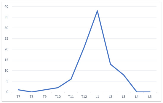 A total of 70 patients presented a one-level fracture, 7 involved a two-level lesion, and 2 involved a three-level fracture. Patients with multiple levels involved did not show any specific comorbidity such as hypothyroidism or osteoporosis. The thoracolumbar junction (T12–L1) was the most affected site: T12 was injured in 21 cases (23.3%) and L1 in 38 cases (42.2%). The next most injured vertebra was L2 in 13 patients (Figure 3). Approximately 88.9% of the fractured levels were comprised between T10 and L2.
