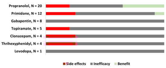 A total of 31 patients (72.1%) were treated with at least one oral medication (1.74 ± 1.1). Considering patients utilizing all oral medications together, 23 (74.2%) dropped out due to either side effects (41.9%), most commonly drowsiness and lightheadedness, or inefficacy (32.3%). Still, despite some improvement, 5 patients required combined therapy with BoNT (4, 12.9%) or surgery (1, 3.2%) to achieve satisfactory benefits. Individualized benefits and side-effect percentages resulting from the different oral medications are summarized in Figure 1.