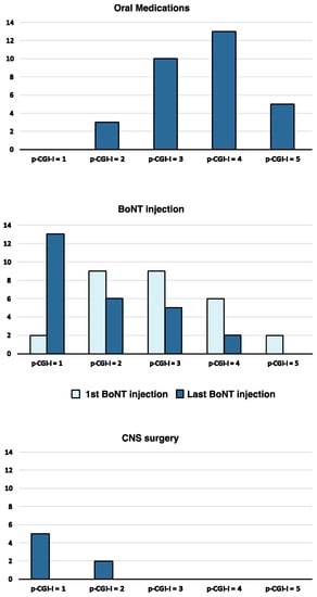 The patient-reported outcomes with the different therapies are represented in Figure 3. With oral medication, 40% of patients reported a p-CGI-I ≤ 3 (improvement) compared to 92% after optimized treatment with BoNT (at the last injection) and 100% after surgery. The percentage of p-CGI-I ≤ 3 was significantly higher when comparing the first and last injection of BoNT (71% vs. 92%, Fisher’s exact test; p = 0.04). There were no significant differences in p-CGI scores in regards to botulinum toxin type (Mann–Whitney U test; p = 0.82) or the usage of EMG guidance (p = 0.4).