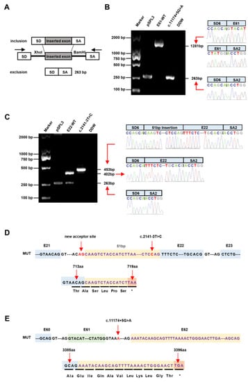 To further identify the pathogenicity of the c.2141-3T>C and c.11174+5G>A variants, wild-type (E22-WT and E61-WT) and mutant (c.2141-3T>C and c.11174+5G>A) minigene vectors were created and transfected to verify the splicing via agarose gel electrophoresis (Figure 1). In the pSPL3 context, the E22-WT construct produced two transcripts; one was a full-length transcript (SD6, E22 and SA2) (402 bp) and the other was a smaller (263 bp) transcript (SD6 and SA2). However, the c.2141-3T>C construct produced a larger transcript of 453 bp including SD6, E22, SA2 and the inserted 51 bp sequences. The E61-WT construct produced a transcript with the expected size (SD6, E61 and SA2) (1281 bp). However, the c.11174+5G>A construct produced a transcript of 263 bp (SD6 and SA2). Subsequent sequence analysis showed that the c.2141-3T>C mutation minigene led to aberrant splicing, as the 51 bp sequence downstream from Intron 21 was restricted (Figure 1). Sequence analysis of the c.11174+5G>A mutation minigene indicated that it lacked the entire Exon 61. HeLa, A549 and HepG2 cells were used to clarify whether this transcriptional change and proportional change in exon exclusion also happened in different cells. Likewise, the c.2141-3T>C mutant minigenes produced a 453 bp transcript in the three cell lines, similar to that in the HEK293 cells after sequencing (see Figure S3). The c.11174+5G>A mutant minigenes produced a transcript that skipped Exon 61.