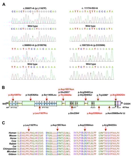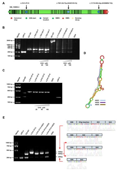 To clarify whether the transcripts from the mutant minigenes were vulnerable to NMD, we used a de novo protein synthesis inhibitor cycloheximide (CHX), which has been shown to inhibit NMD []. Interestingly, after treatment with CHX, the three variants had no effect on the volume or size of these artificial transcripts, suggesting that the c.2141-3T>C, c.7351-2A>T and c.11174+5G>A splicing variants may escape from the control of NMD (Figure 2B,C).
