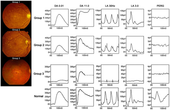 - Sakti, D.H.; Ali, H.; Korsakova, M.; Saakova, N.; Mustafic, N.; Fraser, C.L.; Jamieson, R.V.; Cornish, E.E.; Grigg, J.R. Electronegative electroretinogram in the modern multimodal imaging era. Clin. Exp. Ophthalmol. 2022, 50, 429–440. [Google Scholar] [CrossRef]