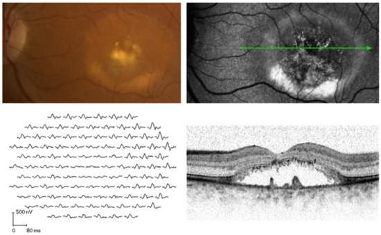 - Renner, A.B.; Tillack, H.; Kraus, H.; Kohl, S.; Wissinger, B.; Mohr, N.; Weber, B.H.; Kellner, U.; Foerster, M.H. Morphology and functional characteristics in adult vitelliform macular dystrophy. Retina 2004, 24, 929–939. [Google Scholar] [CrossRef] [PubMed]