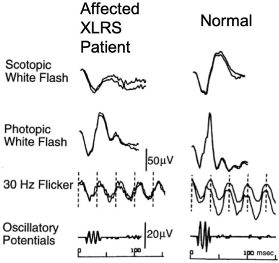 - Khan, N.W.; Jamison, J.A.; Kemp, J.A.; Sieving, P.A. Analysis of photoreceptor function and inner retinal activity in juvenile X-linked retinoschisis. Vis. Res. 2001, 41, 3931–3942. [Google Scholar] [CrossRef] [PubMed]