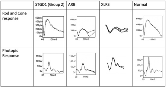 - Stavrou, P.; Good, P.A.; Misson, G.P.; Kritzinger, E.E. Electrophysiological findings in Stargardt’s-fundus flavimaculatus disease. Eye 1998, 12 Pt 6, 953–958. [Google Scholar] [CrossRef] [PubMed]