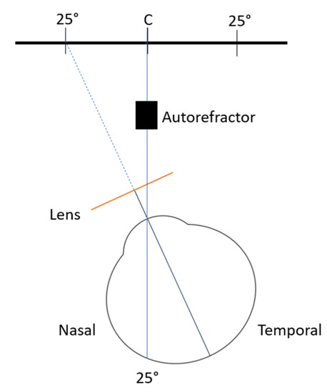 Schematic illustration of the measurement of the peripheral refraction at 25° temporal retina of the right eye. Not to scale.