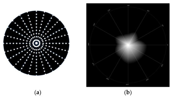 Light disturbance was obtained using a light distortion analyzer (LDA, Binarytarget Lda., Braga, Portugal). This device has a circular electronic black board with a central light spot with high-intensity light [18]. This central light is an LED that is surrounded by 240 smaller and less intense LEDs distributed over 24 semi-meridians with an angular separation of 15°, as demonstrated in Figure 3 below. The central LED is responsible for creating the glare condition while the peripheral LEDs are used as limit discriminators of that condition at separate locations in the visual field. These physical LEDs allow the measurement of some parameters of light disturbance under more realistic conditions [19].