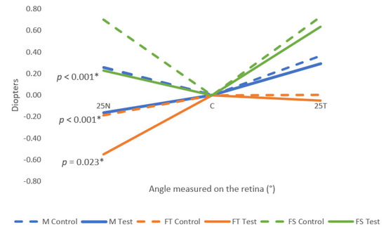 Relative mean values of M, FT, and FS for the three points measured (25T, C, 25N) for both control and test conditions. 25N: 25° eccentricity at nasal retina, 25T: 25° eccentricity at temporal retina. Standard deviation is not shown for clarity and can be consulted in Table 2. The symbol * marks the statistically significant differences (p-value < 0.05).