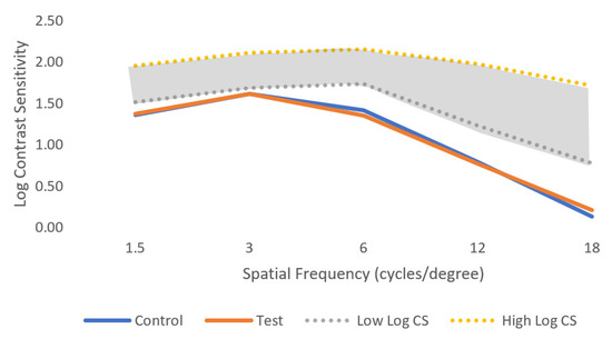 Mean of log visual contrast sensitivity for control and test conditions for the five spatial frequencies evaluated under low light conditions. The shaded area represents the normal ranges under photopic conditions for comparison. Standard deviation is not shown for clarity and can be consulted in Table 3.