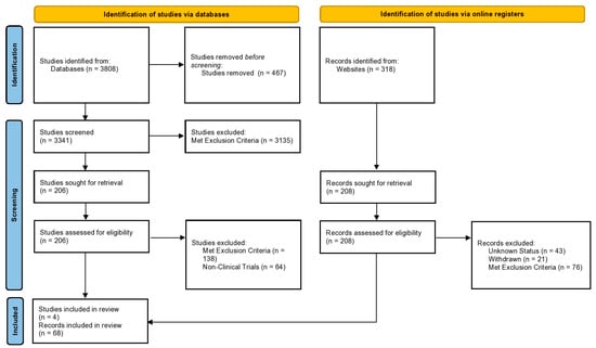 During the identification of studies via databases, a total of 3808 studies were identified, of which 467 duplicates were removed. A total of 3341 studies were screened with titles and abstracts, after which 3135 met the exclusion criteria. Finally, 206 full-text studies were assessed, of which four Phase III clinical trials were included in this systematic review. During the identification phase of clinical trial records, a total of 318 were identified from websites. Of these, 208 records were sought for retrieval and assessed for eligibility. Of them, 68 records were included in this systematic review. The PRISMA flowchart depicting the study selection process is illustrated in Figure 1.